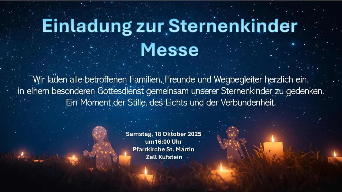 Anlässlich des Gedenktages für Sternenkinder (15. Oktober) feiern wir am 18. Oktober um 16 Uhr in der Pfarre Zell einen Gottesdienst, bei dem wir den Sternenkindern gedenken.