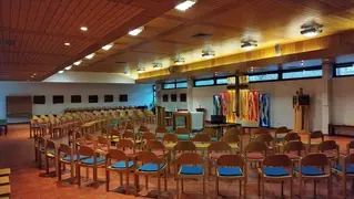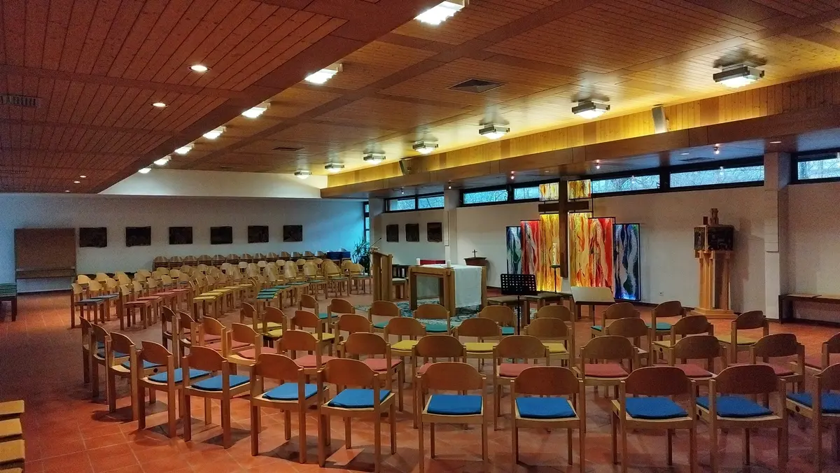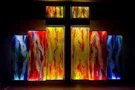 Die Glaselemente sollen einen Regenbogen darstellen, der ja ein Symbol für den Bund den Gott mit den Menschen schloss, ist.